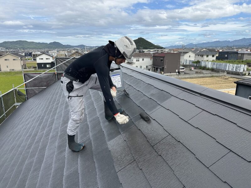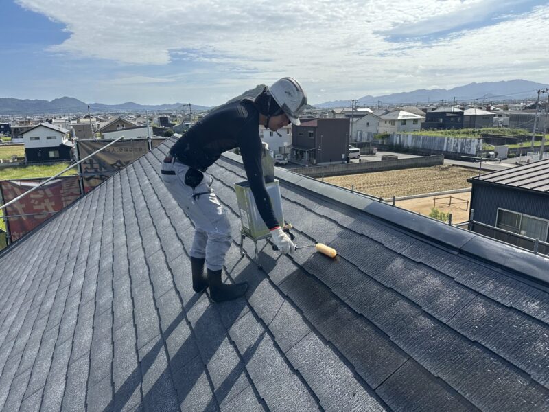 本日の現場作業は高松市上林町にて鉄部塗装、付帯部塗装を行いました。まずは、屋根塗装のご紹介です。