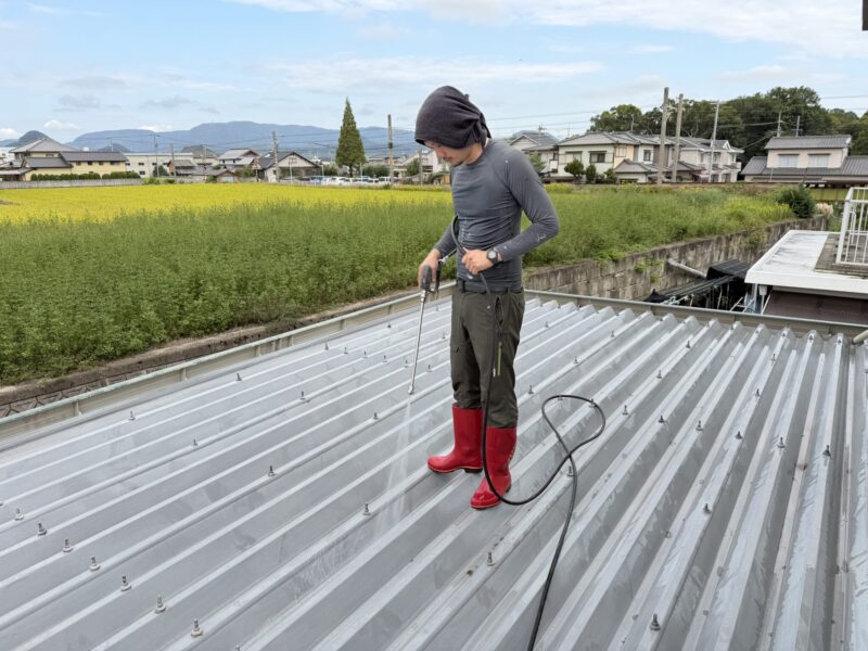 折半屋根だったので、研磨道具を使って入念に研磨した後、高圧洗浄で洗い流しました。こちらの物件は高圧洗浄を完了し、本日の現場作業は終了です。