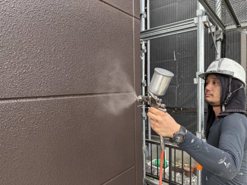 外壁塗装の最終工程、コーティングです。コーティングする事で、塗膜の耐久年数も上がり、汚れの付着も少なくなります。こちらの物件は外壁コーティングを完了し、本日の現場作業は終了です。