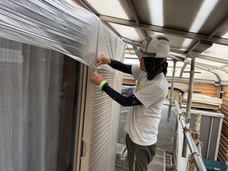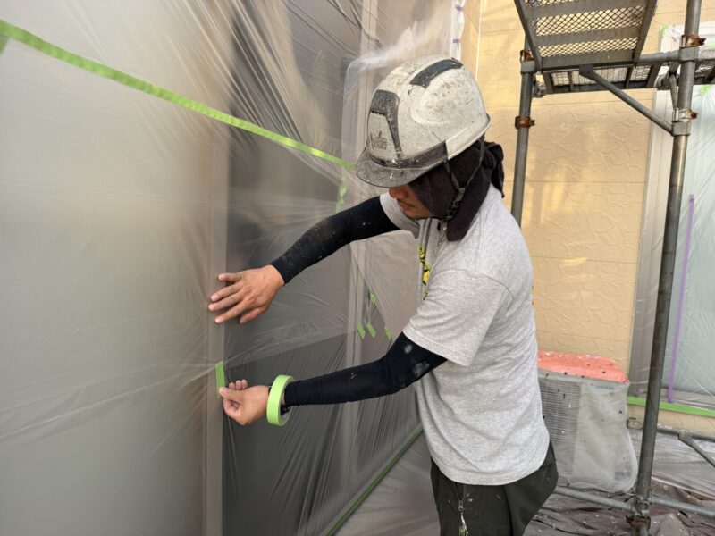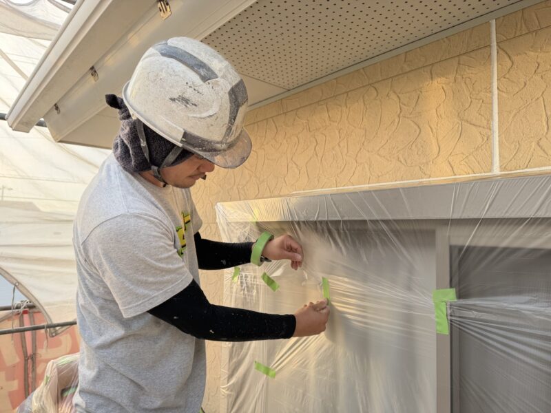 塗料が飛散して汚してはいけない所を、養生テープで覆い隠していきました。塗装作業において、塗料が一番飛散するのは軒天井塗装と外壁塗装なので、飛散するであろう所はすべて養生させて頂きました。こちらの物件は養生を完了し、本日の現場作業は終了です。