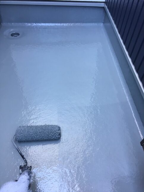 塗料メーカー様が特許を取っているローラーを使っての施工なので、モザイクを入れてます。模様をつけた後、クリヤー塗装を行います。