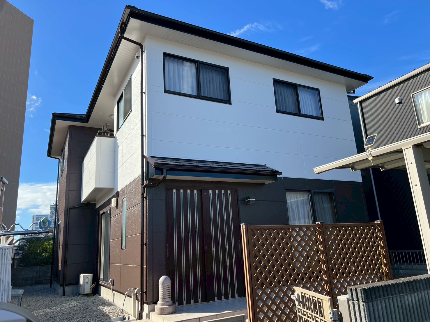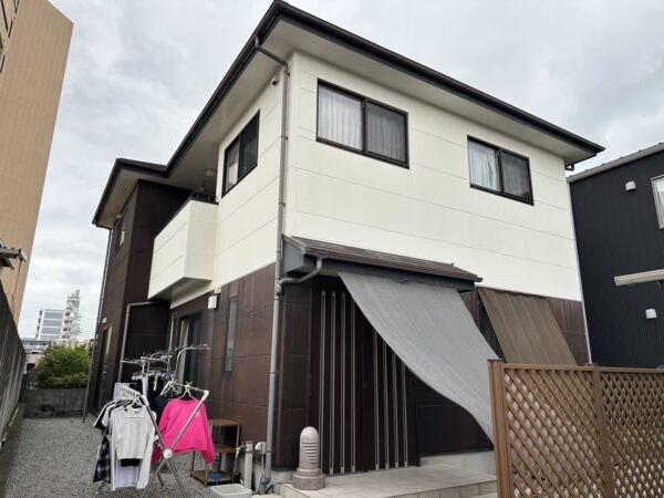 茶色い部分が白っぽくなり、白い部分は黒ずみが目立っていた外壁。
